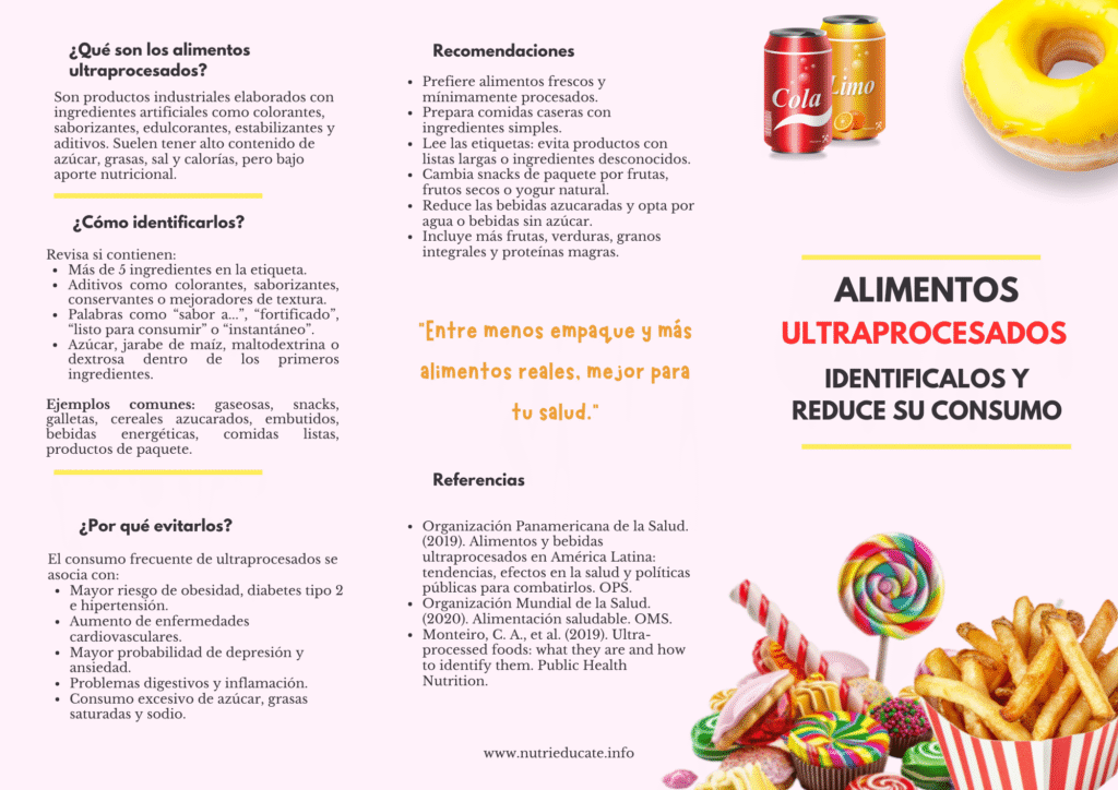 Este folleto explica de manera sencilla qué son los alimentos ultraprocesados, cómo identificarlos y por qué es importante reducir su consumo. Su objetivo es brindar a los estudiantes y sus familias información práctica y basada en evidencia para favorecer decisiones alimentarias más conscientes y saludables en la vida diaria.
