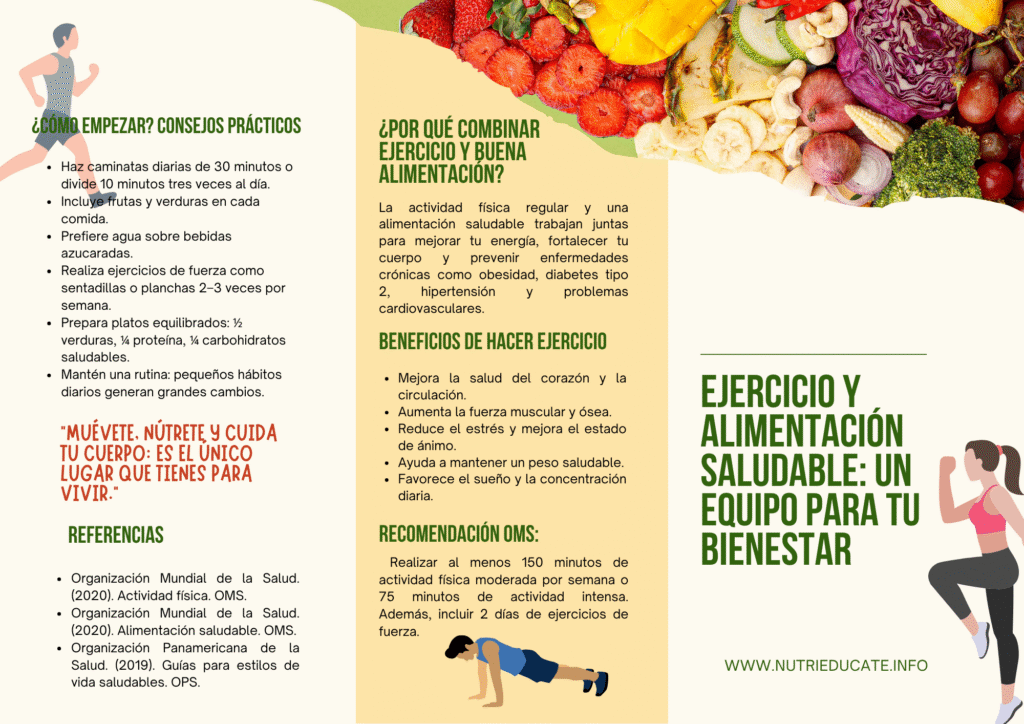 Este folleto presenta de manera sencilla la importancia de combinar la actividad física regular con una alimentación saludable para mejorar el bienestar general. Su contenido ofrece recomendaciones prácticas basadas en evidencia científica, con el propósito de orientar a los estudiantes y sus familias en la adopción de hábitos que promuevan una vida más activa, equilibrada y saludable.
