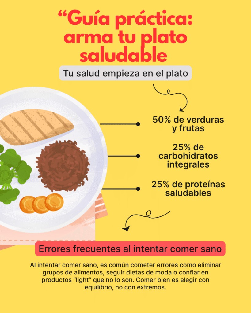 En esta guía visual encontrarás cómo debe verse un plato realmente saludable y cuáles son los errores más comunes al intentar “comer sano”. La información está presentada de forma sencilla para ayudarte a equilibrar mejor tus comidas y tomar decisiones más conscientes cada día.